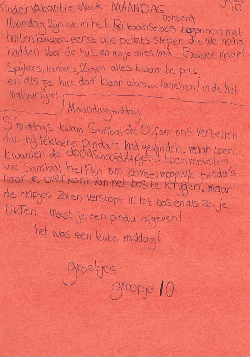 Tijdens het middageten krijgen de kinderen per groepje ook een zakje pinda's, dit is een cadeautje van olifant Sambal. Voor haar kindjes zijn dit lekkere snoepjes van de hele wereld. Helaas hebben de doodshoofdaapjes dit geroken en zijn teruggekeerd naar het bos. Zij willen de pinda's en misschien ook wel een paar lekkere kindjes. We moeten de pinda's langs de doodshoofdaapjes smokkelen (douanespel) Groep met de volste emmer krijgt een puntje op het scorebord.