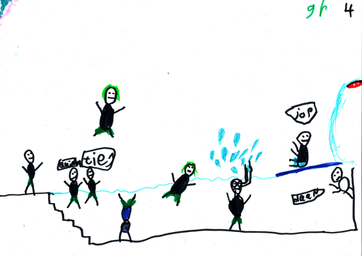 Na de ochtendgymnastiek waren de kinderen fit genoeg om later te kunnen zwemmen. Na het ontbijt en het opruimen van de spullen zijn we groepje voor groepje naar de Brink gelopen waar we lekker even zijn wezen zwemmen. Ties, Quinn, Job en Daan K hebben gespeeld dat ze in een boot aan het varen waren. Daan bestuurde de boot en de andere 3 jongens speelde zeemonsters. Ook dit jaar gingen de kinderen weer veel van de glijbaan. De groepjes werden omgeroepen als ze zich moesten omkleden. Ze kregen voor het omkleden nog een glaasje ranja en een snoepje.