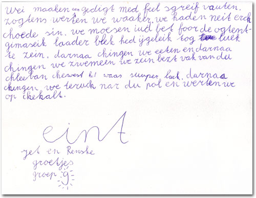 Onze strak getrainde Erik startte de dag met een actieve ochtendgymnastiek. Hij is natuurlijk erg lenig dus veel kinderen verwachten spierpijn. Toen het laatste lied afgelopen was mochten ze nog even lekker vrij dansen. Erik kwam ineens terug gerend. Hij had een meisje op zijn arm! Het meisje vertelde dat ze ook was neergestort met het vliegtuig . Ze kwam uit Hawai. Ook had ze al vier dagen niet meer gedronken! De kinderen riepen dat ze gingen zwemmen en het meisje wilde wel mee.