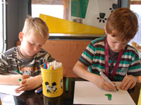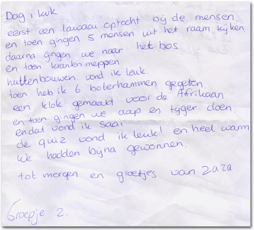 Door middel van de spellen die we maandagmiddag deden probeerden we de Afrikaan vrolijk te maken en Nederlands te laten praten. De spellen gingen van fantasie apen schilderen, tot banaantjes happen met een sigaar als beloning. Voor de kinderen was het natuurlijk een hele uitdaging om de afrikaan blij te maken, hij was écht kwaad… Nadat alle kinderen iets voor de afrikaan gemaakt hadden, gingen ze zich inleven in het leven in de jungle. De ‘tijgers’ gingen de ‘aapjes’ achtervolgen om zoveel mogelijk staartjes te pikken. Nadat de kinderen hun draai in het jungle leven helemaal gevonden hadden, was het tijd voor ranja. De groepsleiding vond dat de kids toch iets meer van de wereld moesten leren om de Afrikaan te begrijpen. Daarvoor hadden we de ‘ik houd van de wereld’ quiz gevonden. Gezellig met z’n allen op de open plek zo snel mogelijk antwoorden op de vragen, om per groep zoveel mogelijk punten te verdienen! De rivaliteit tussen de groepen liep hóóg op, iedereen werd erg fanatiek, de leiding was ook erg motiverend voor de groepjes.