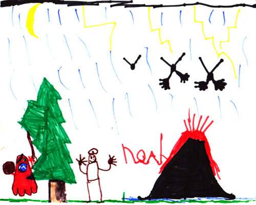 Op maandagmorgen kregen de kinderen van de kvk de schrik van hun leven. Een boze Afrikaan kwam bij de muziekkoepel in Zelhem, met een stewardess als gijzelaar. De Afrikaan was niet te verstaan en deed erg raar. Met handen en voeten kwamen we erachter dat zijn hoofdtooi gestolen was, wat verschrikkelijk is, omdat dit een teken van koningschap is in Afrika! De Afrikaan beschuldigde de stewardess van de diefstal, hij was woedend. De stewardess was natuurlijk helemaal niet de schuldige, en omdat ze zo verschrikkelijk werd behandeld voelden de kinderen de drang om de stewardess te helpen.