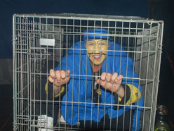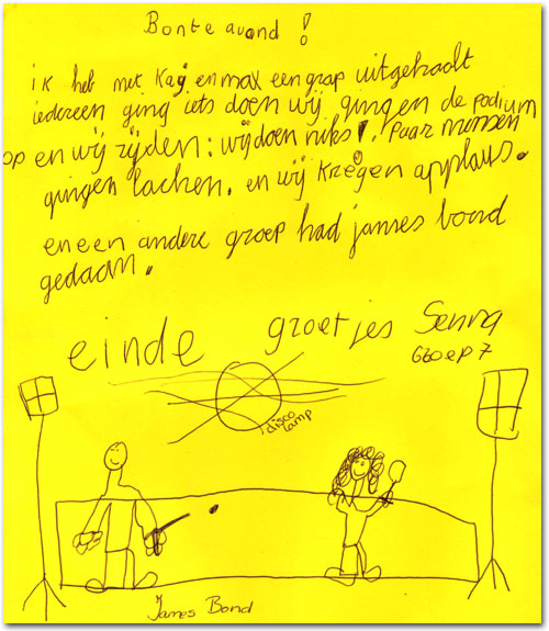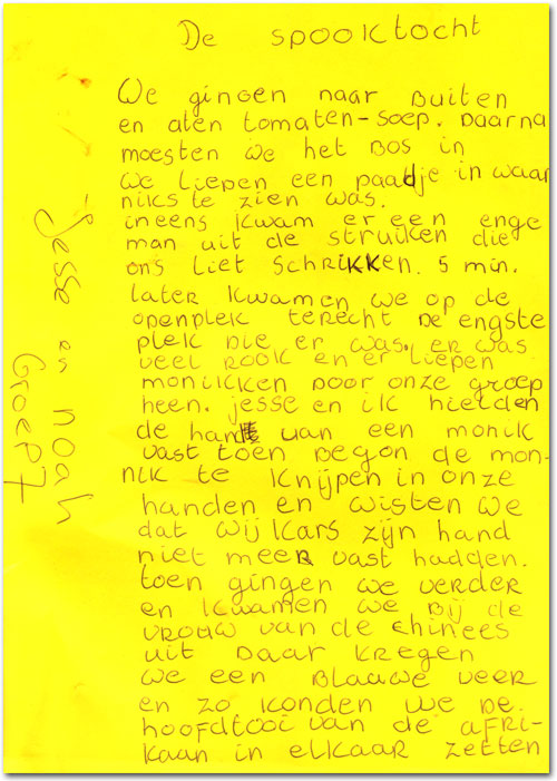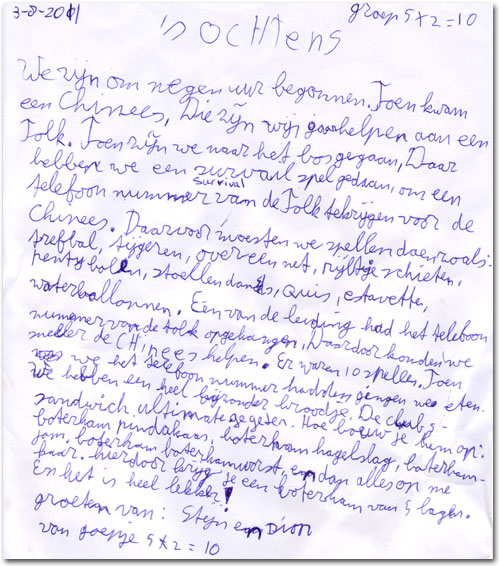 Nadat we allemaal onze slaapspulletjes in de sporthal neergezet hadden, was er weer een grote verassing. Er stond plotseling een raar figuur in een blauw gewaad naast Lizzy. Hij had spleetogen en praatte erg raar. We kwamen er al snel achter dat de gekke meneer een chinees was. De kinderen probeerden met al het enthousiasme dat ze in zich hadden een tip, aanwijzing of ook maar iets over het neergestorte bananenvliegtuig uit hem te krijgen. Helaas was het enige dat de chinees zei: Mi Hao! We kwamen met z’n allen tot de conclusie dat we een tolk nodig hadden, maar daar is wel heel veel geld voor nodig..