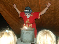 De hoofdtooi van de afrikaan was door het hele bos verstopt. Elke groep kreeg de opdracht om één veer mee te nemen uit het bos, maar hierbij waren natuurlijk een hoop obstakels. Het begon met de broer van de afrikaan, die ons veel succes wenste. Daarna kwamen we allerlei rare en enge dingen tegen, de Bosjesman, een poppenkast met een spook erin, een man die een meisje aanviel omdat ze verdwaald was, etc. Gelukkig wilden de meesten ons wel helpen, en bij de geisha kregen we een veer voor de hooftooi! Op de open plek werd de chinees opgesloten, en de groepjes konden weer veilig terug naar de sporthal.