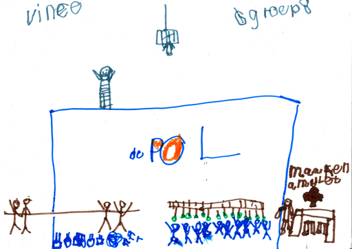 Wat een pech, het begint te regenen. Gelukkig zijn ze van de kindervakantieweek op alles voorbereid en wordt in rap tempo de lunch naar de sporthal gebracht. Zo kunnen we droog lunchen. Dat is een keer wat anders dan in het bos, zo met 10 groepjes bij elkaar.